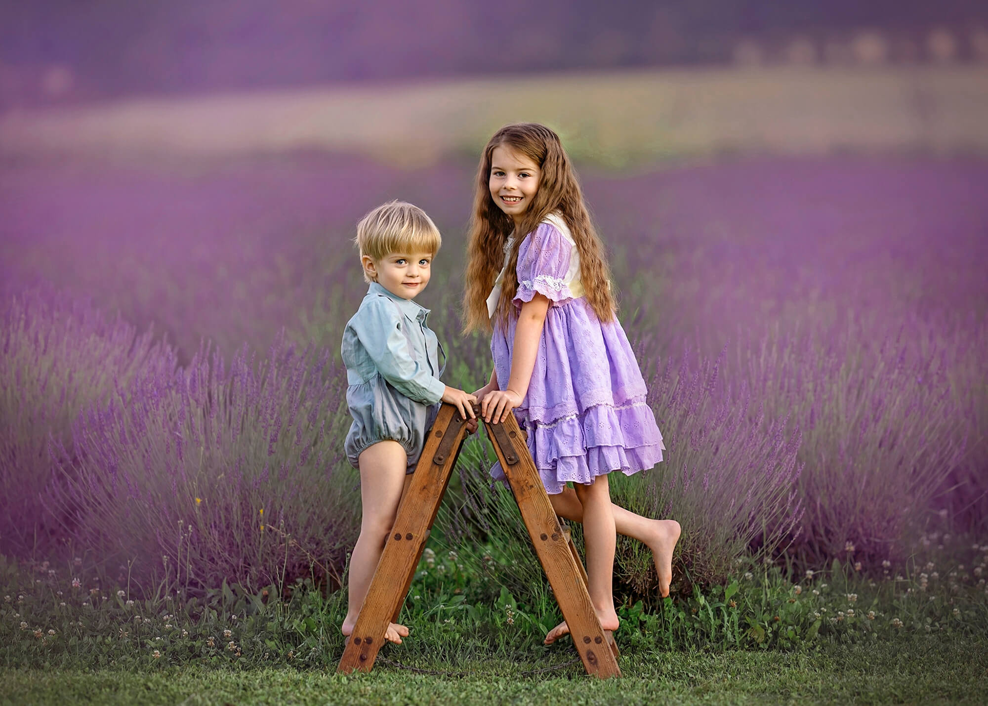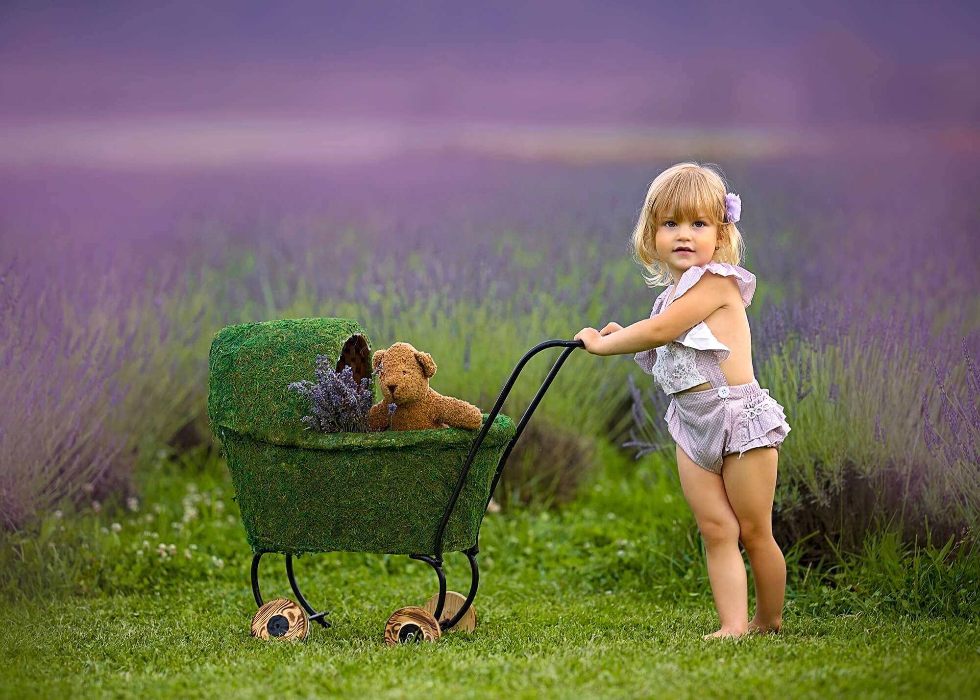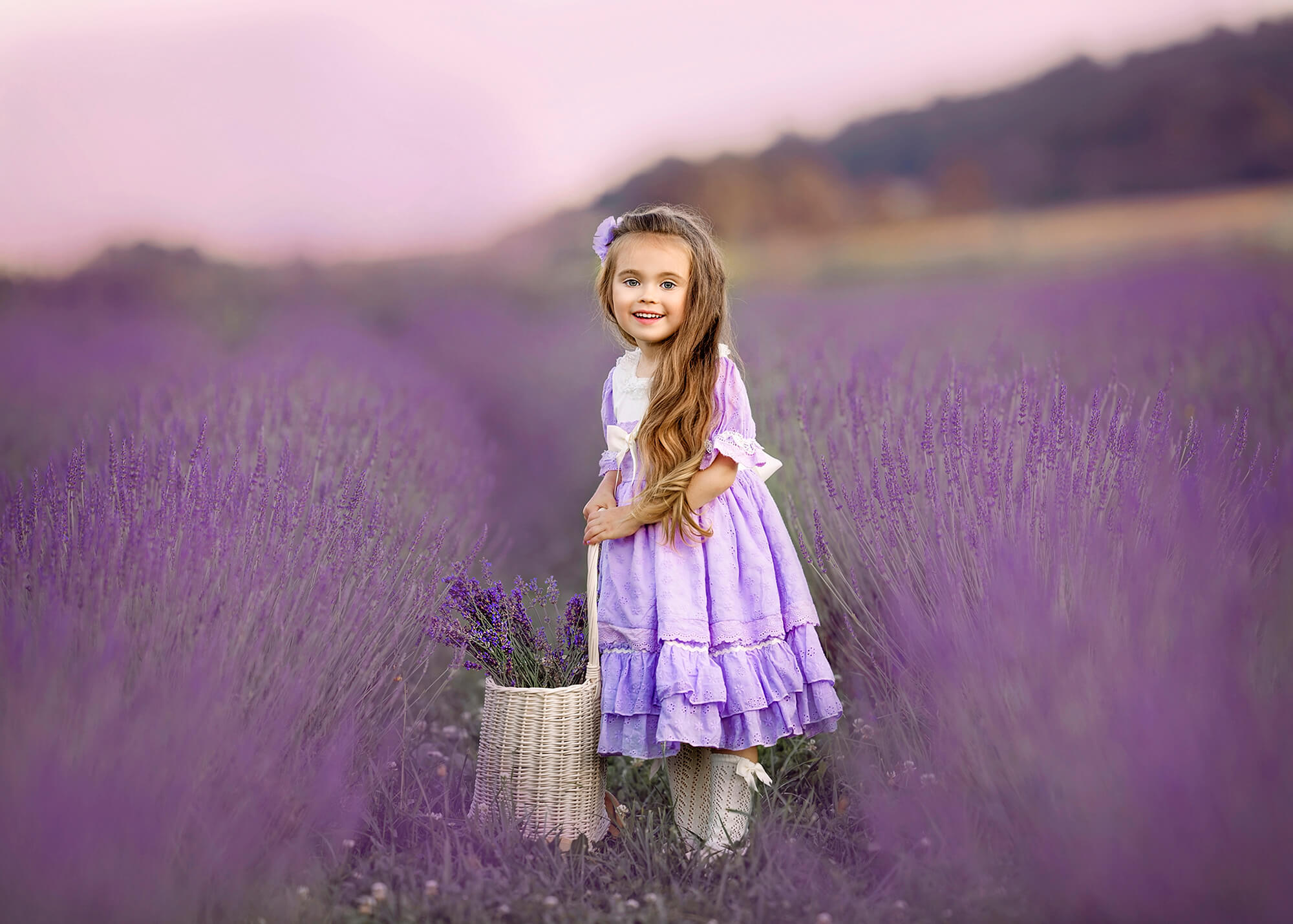 Sesje w lawendzie najpiękniej komponują się z podobnymi do niej odcieniami (fiolet, pudrowy róż), pasuje do nich również kontrastowa żółć lub ponadczasowa biel. Poszukaj w swojej szafie ubrań właśnie w takich kolorach. Warto również wspomnieć o stylizacjach, które przygotowuję na sesje lawendowe. Każde detale są ważne, aby uchwycić esencję letniej beztroski. Oferuję różnorodne ubrania, które harmonizują z lawendowym tłem – od lekkich, zwiewnych sukienek kobiecych, po ubrania dziecięce, takie jak sukienki w stylu hiszpańskim, rampersy, spodnie na szelkach czy ażurowe sweterki.